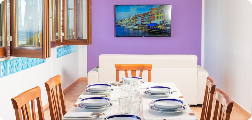 La cucina è completamente attrezzata, adiacente la zona soggiorno con tavolo da pranzo e comodo divano.